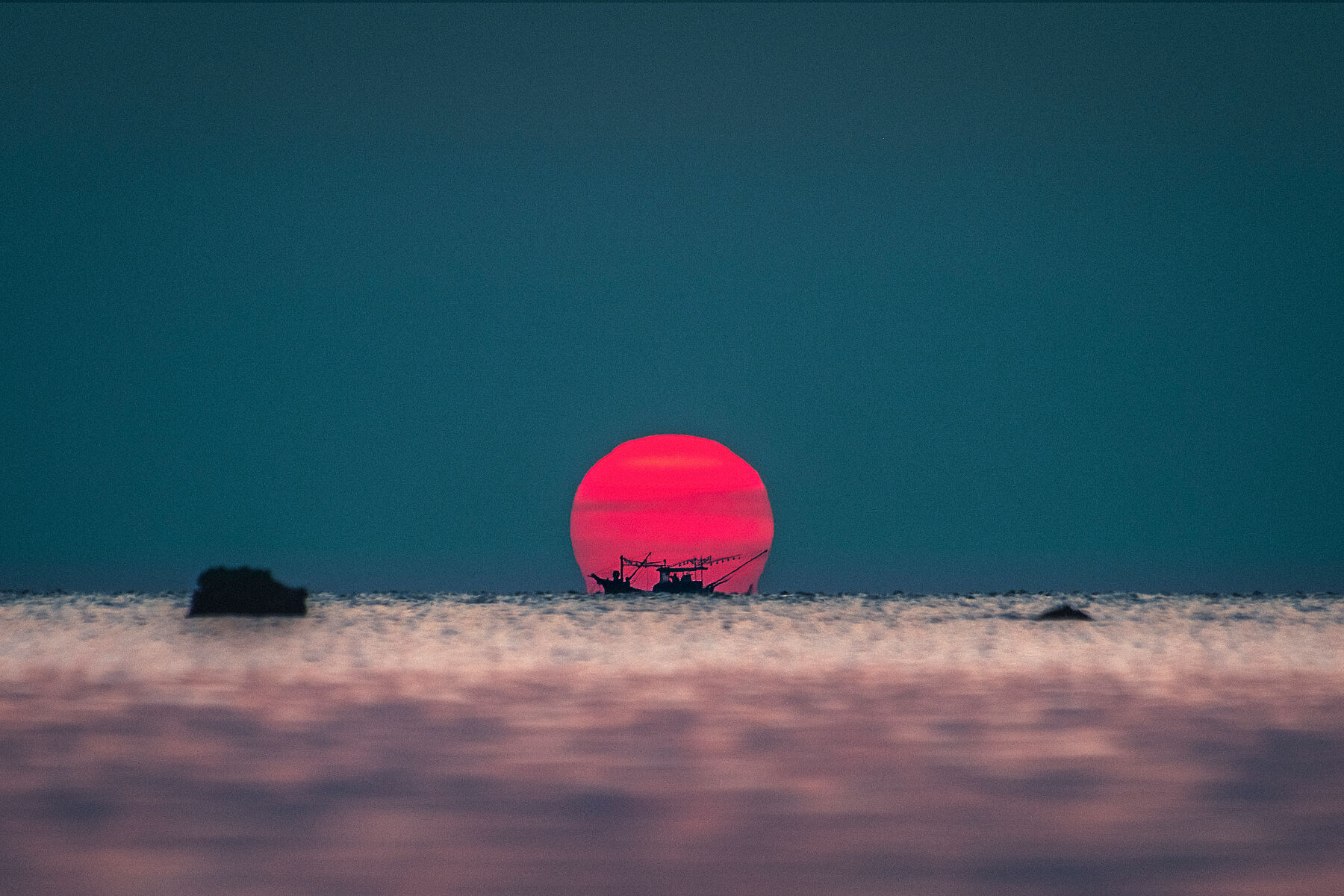 The sun aligns with a passing fishing boat in Koh Pha Ngan, Thailand