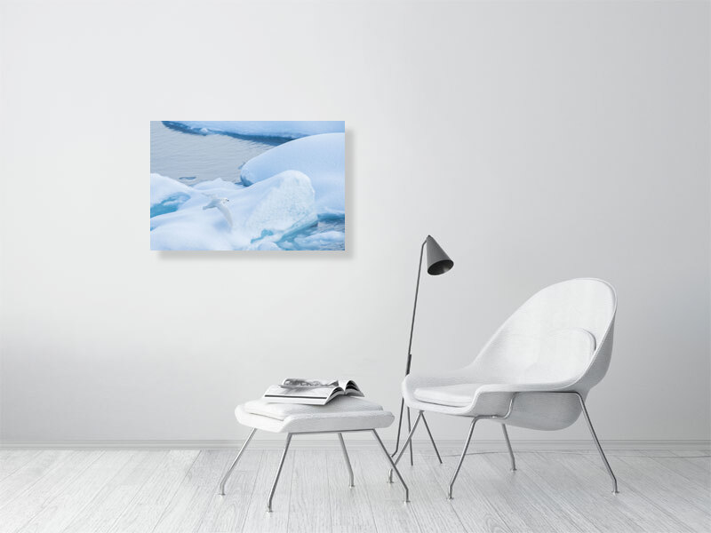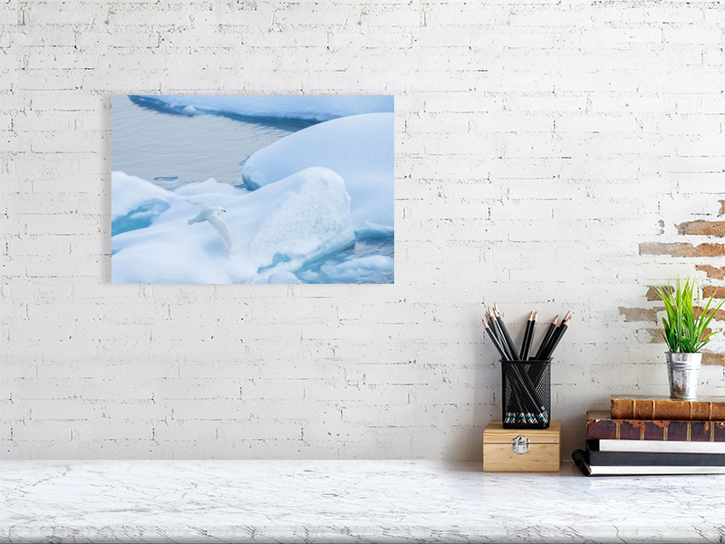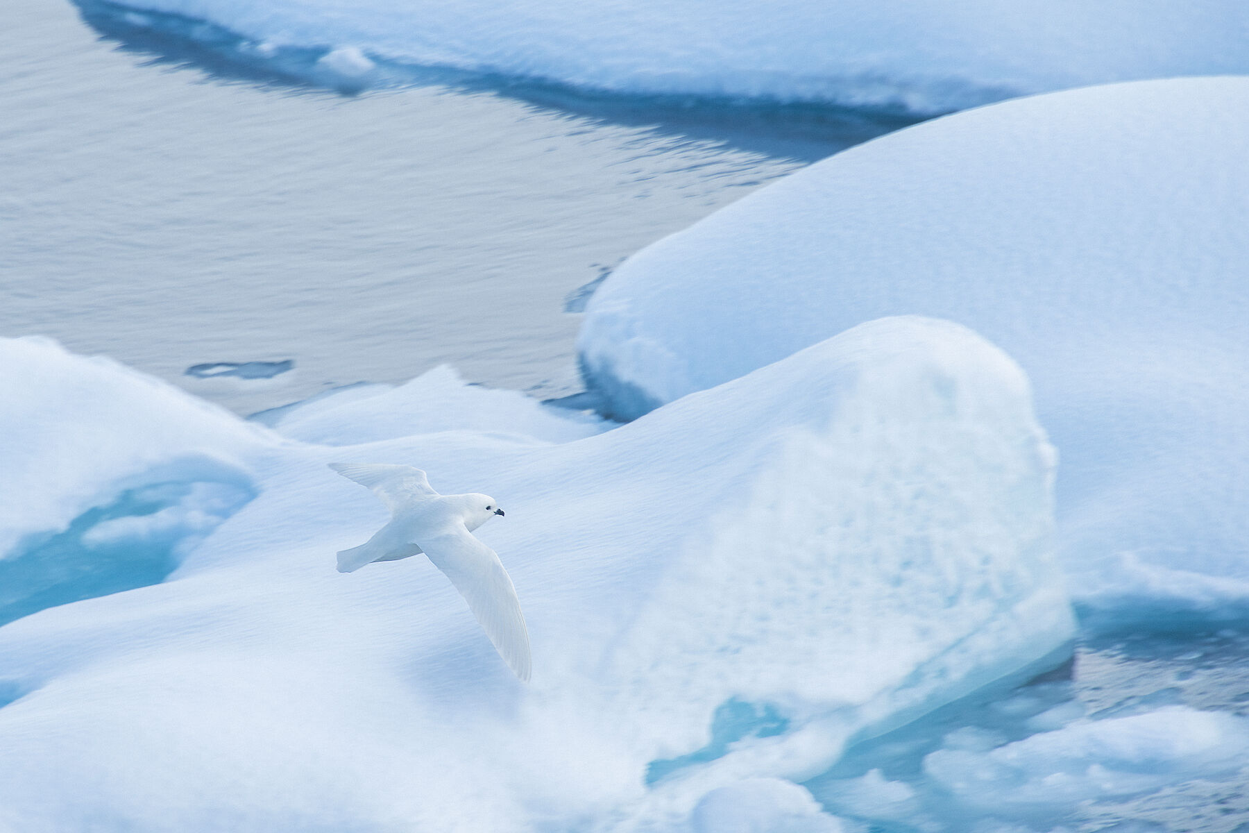 A snow petrel glides over the snow in the Southern Ocean in Antarctica