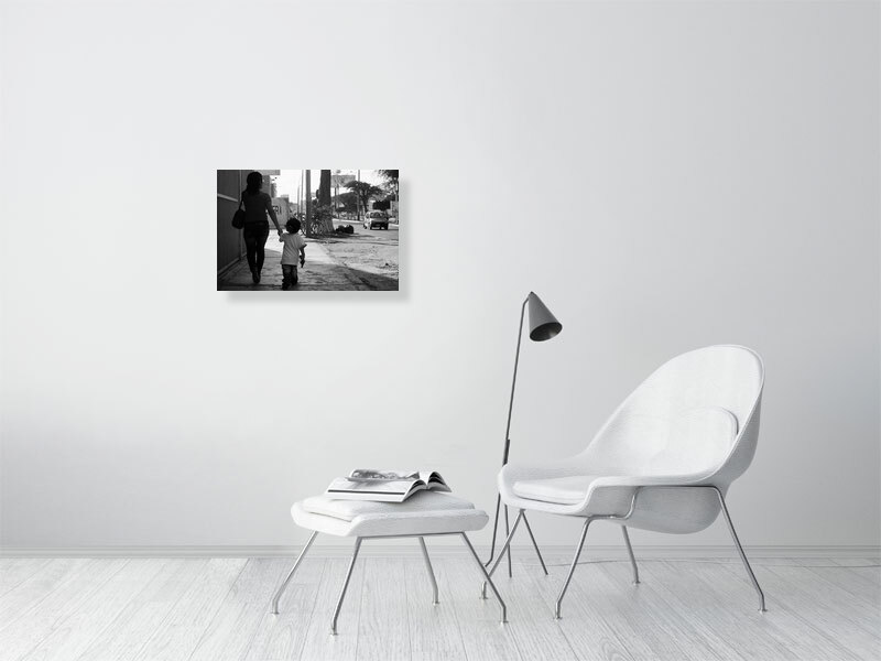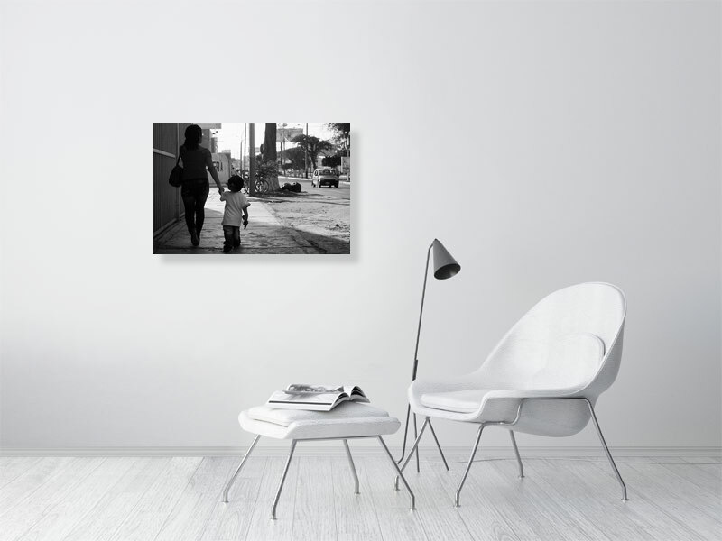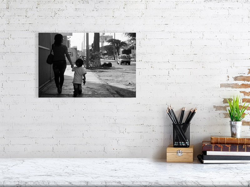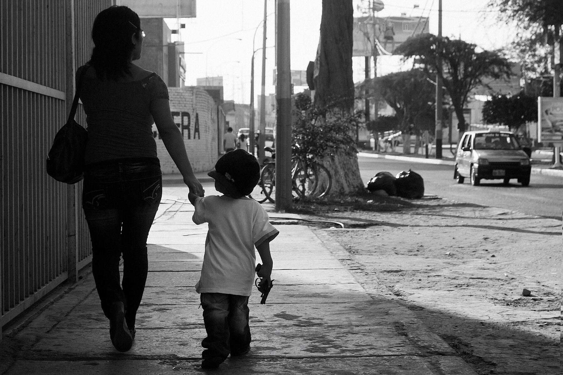 A mother walks hand in hand with her armed son on the streets of Piura, Peru