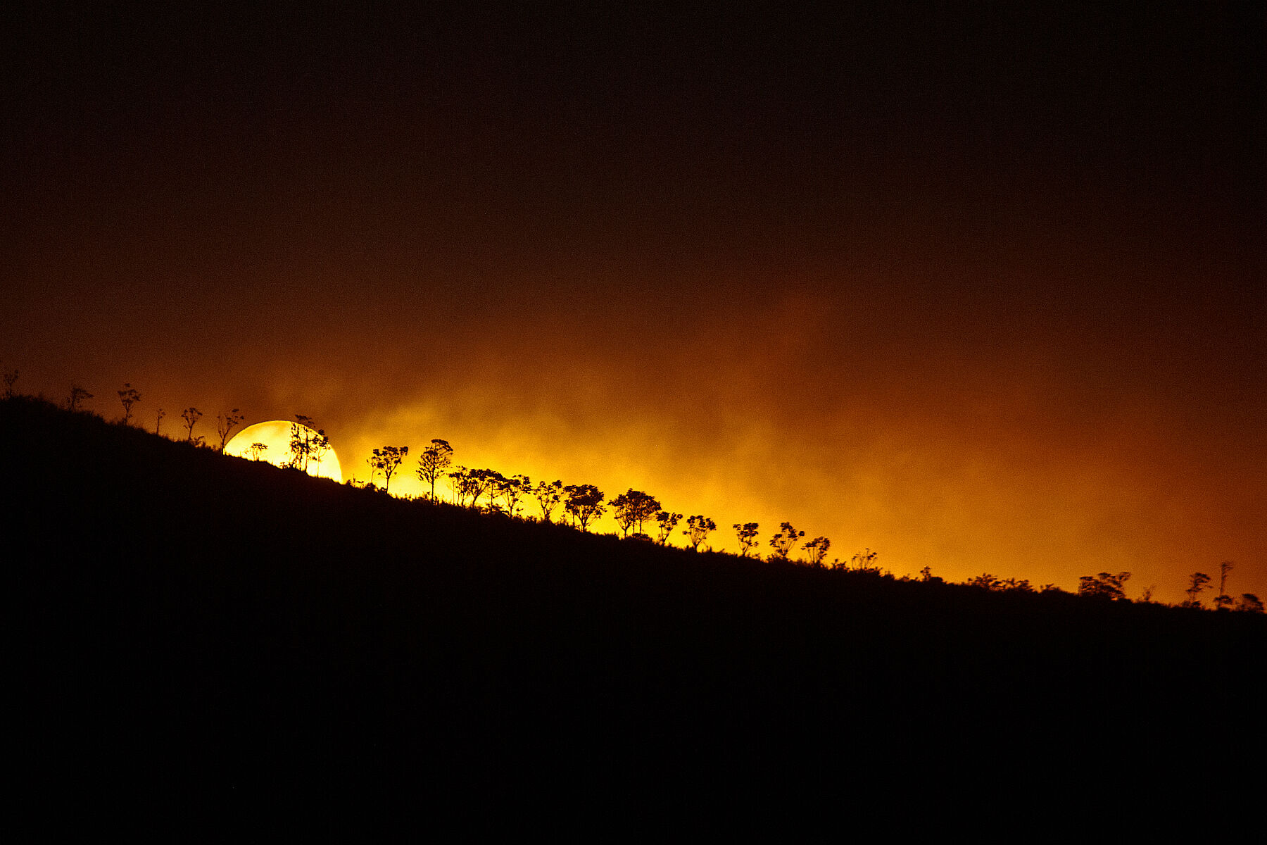 The sun drops behind a tree-lined hill on the island of Santa Cruz in the Galapagos, Ecuador